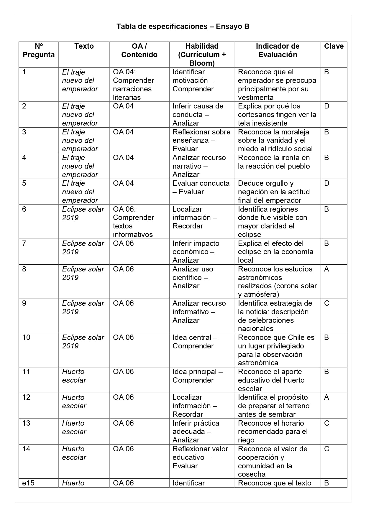 Cada pregunta fue verificada en contenido, redacción y clave correcta, asegurando la concordancia con los textos, los indicadores de evaluación y el lenguaje pedagógico chileno.