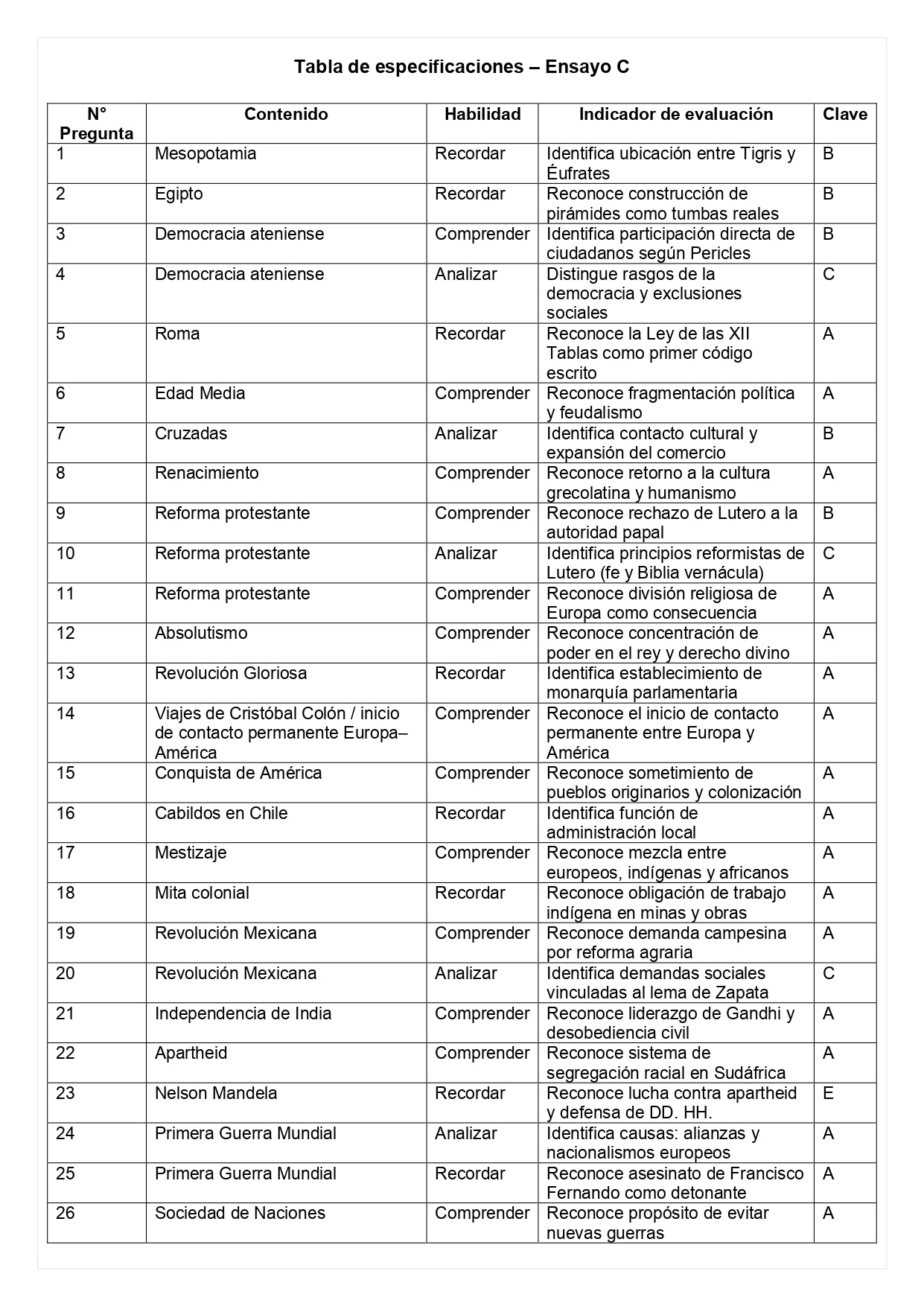 La tabla de especificaciones y la hoja de respuestas están incluidas y plenamente concordantes con el ensayo.