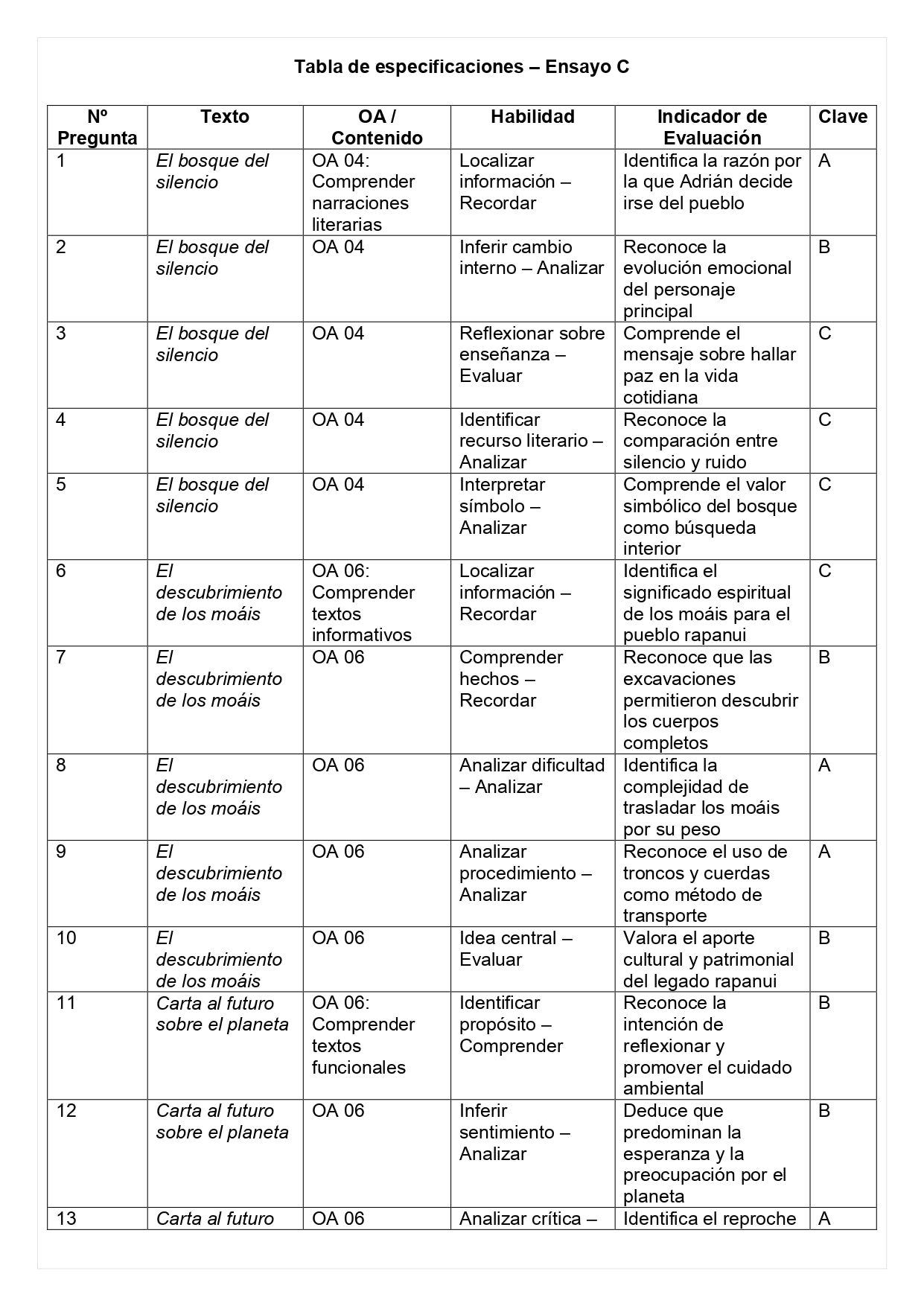 La tabla de especificaciones y la hoja de respuestas docente están incluidas y totalmente concordantes con el ensayo.