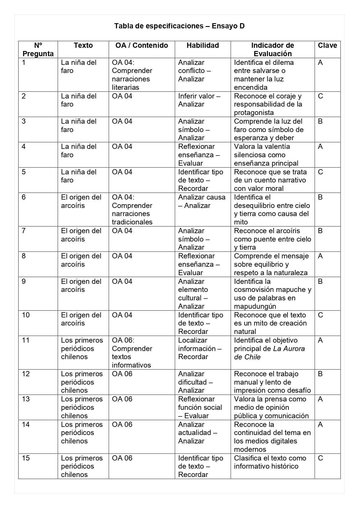 Cada pregunta fue verificada en contenido, redacción y clave correcta, asegurando la concordancia con los textos, los indicadores de evaluación y el lenguaje pedagógico chileno.