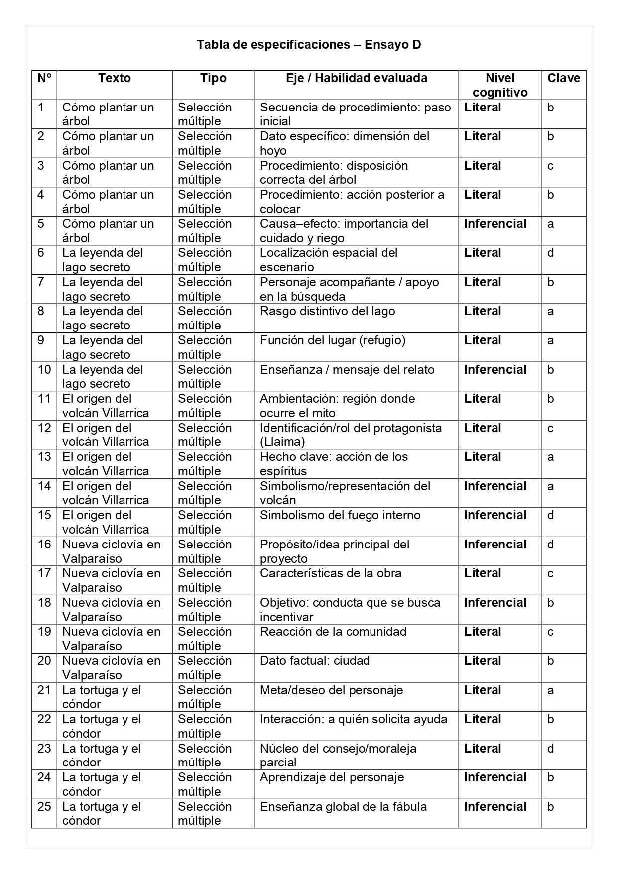 Los cinco ensayos (A, B, C, D y E) presentan una progresión real de dificultad, desde niveles literales hasta inferenciales y evaluativos.
