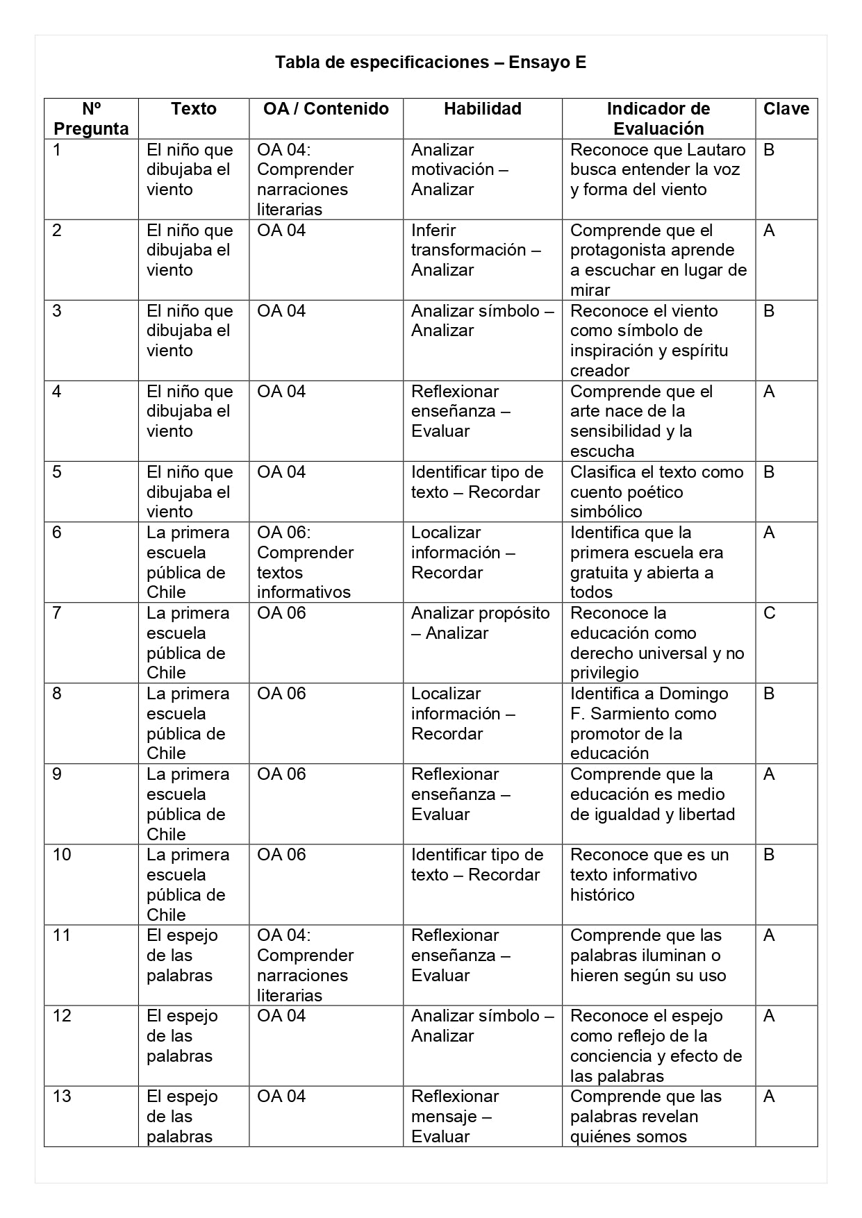 Cada pregunta fue verificada en contenido, redacción y clave correcta, asegurando la concordancia con los textos, los indicadores de evaluación y el lenguaje pedagógico chileno.