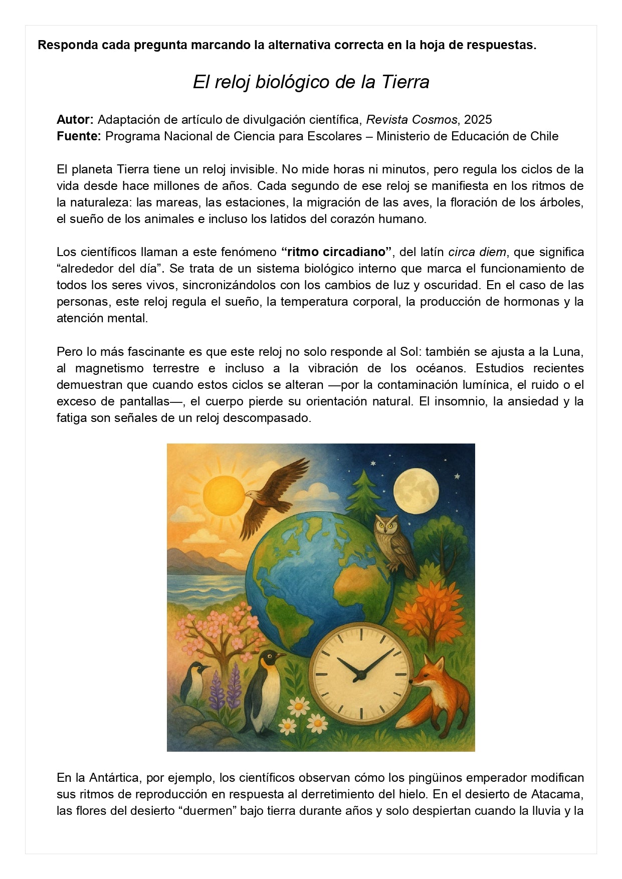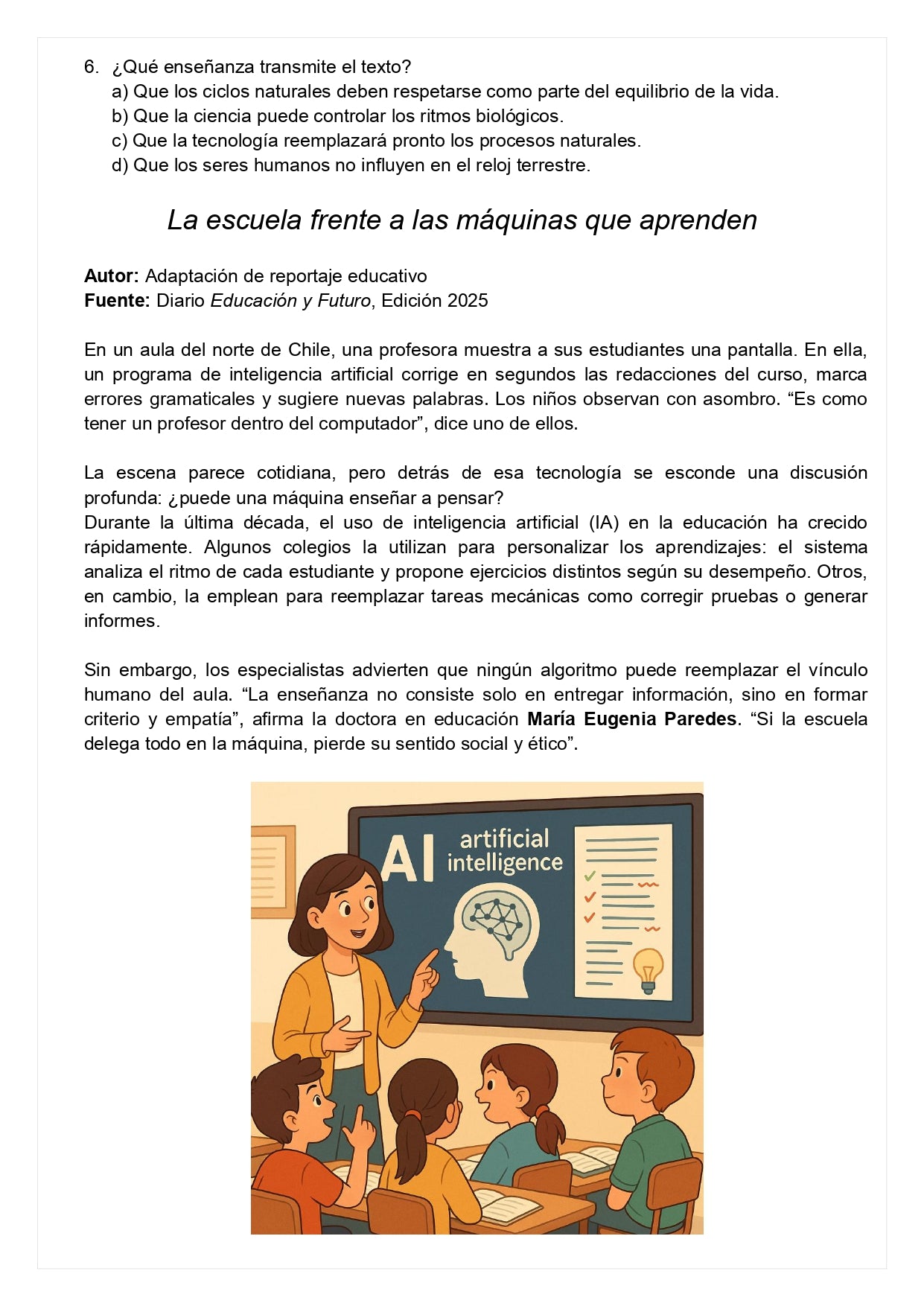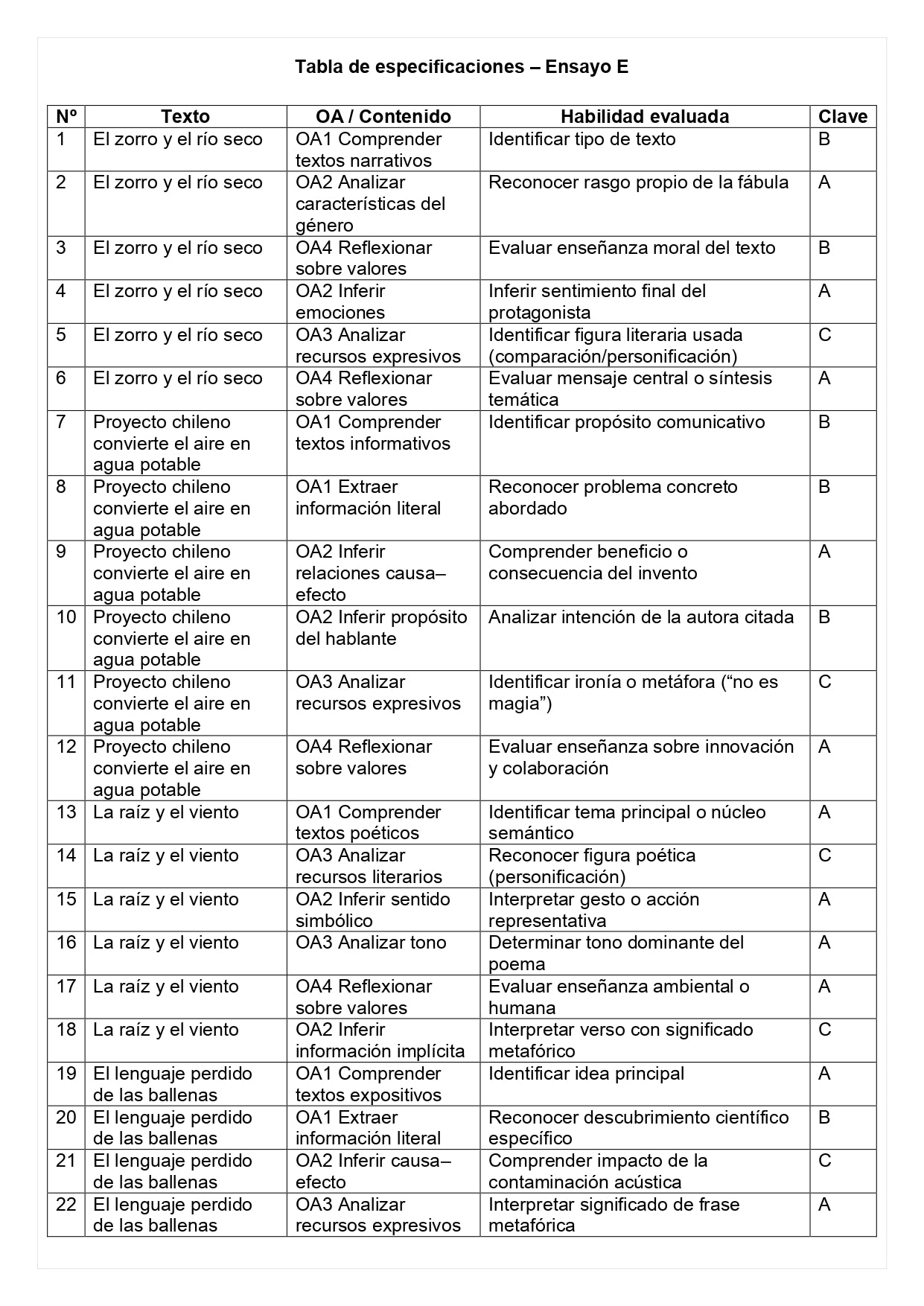 Cada pregunta fue verificada en contenido, redacción y clave correcta, asegurando la concordancia con los textos, los indicadores de evaluación y el lenguaje pedagógico chileno.