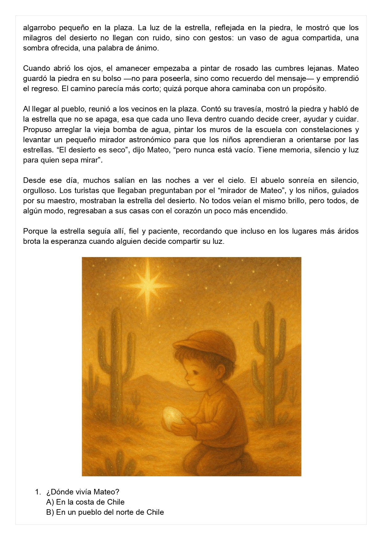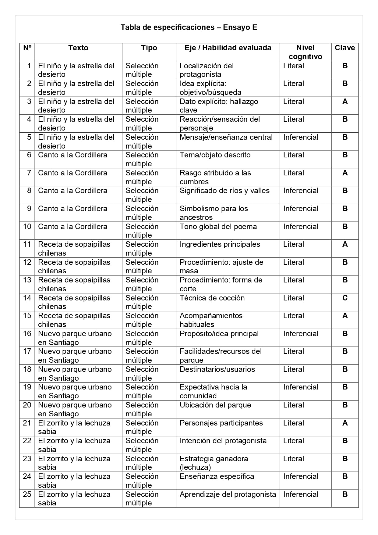 Cada pregunta fue verificada en contenido, redacción y clave correcta, asegurando la concordancia con los textos, los indicadores de evaluación y el lenguaje pedagógico chileno.