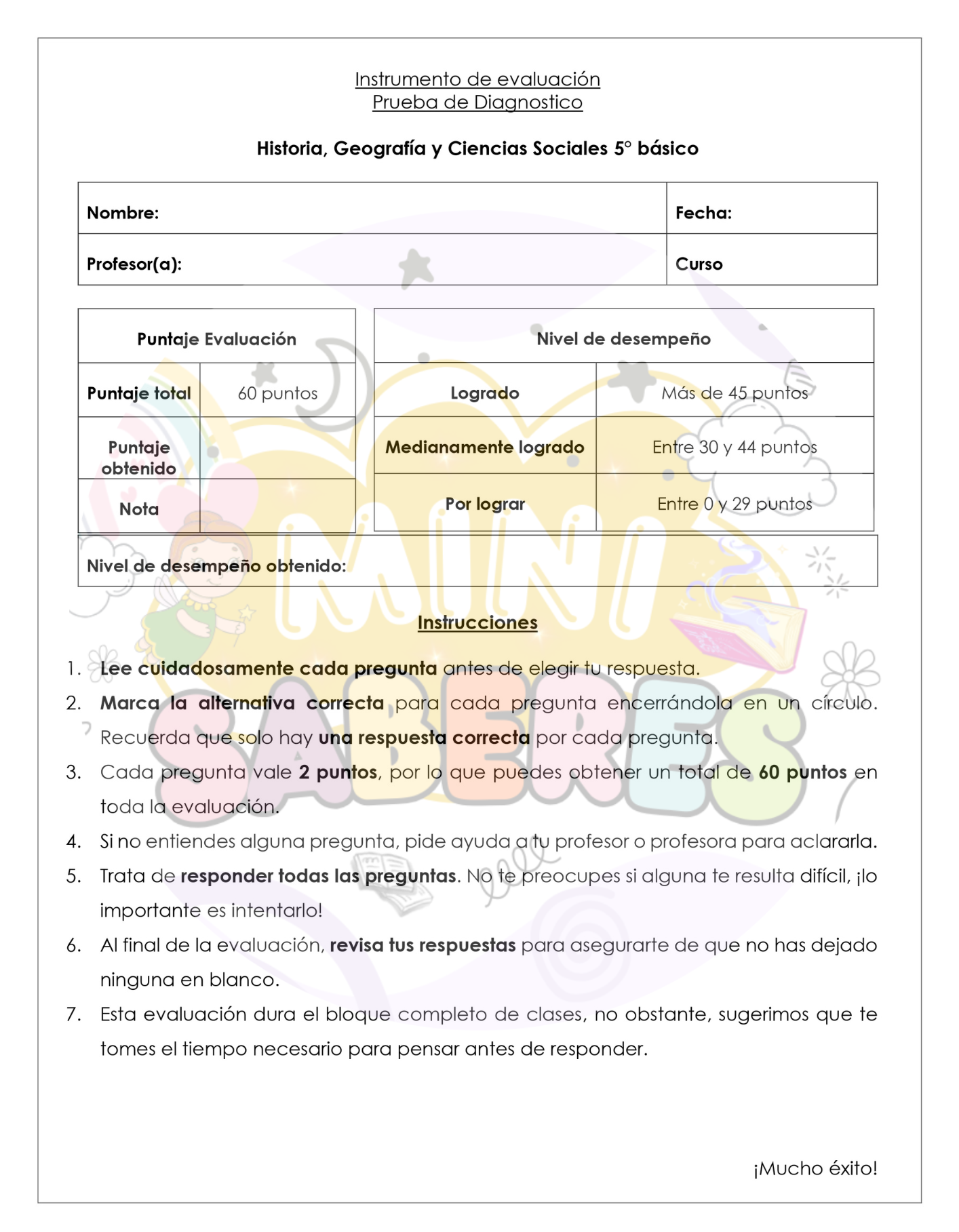 Evaluación Diagnóstica de Historia, Geografía y Ciencias Sociales para 5° Básico