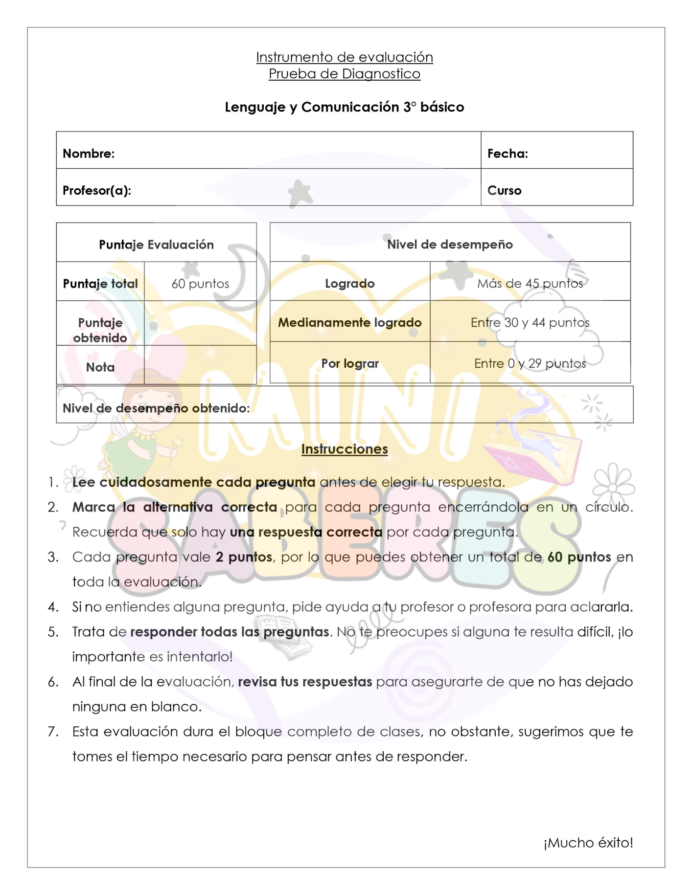 Evaluación Diagnóstica - Lenguaje y Comunicación (LyC) 3° básico