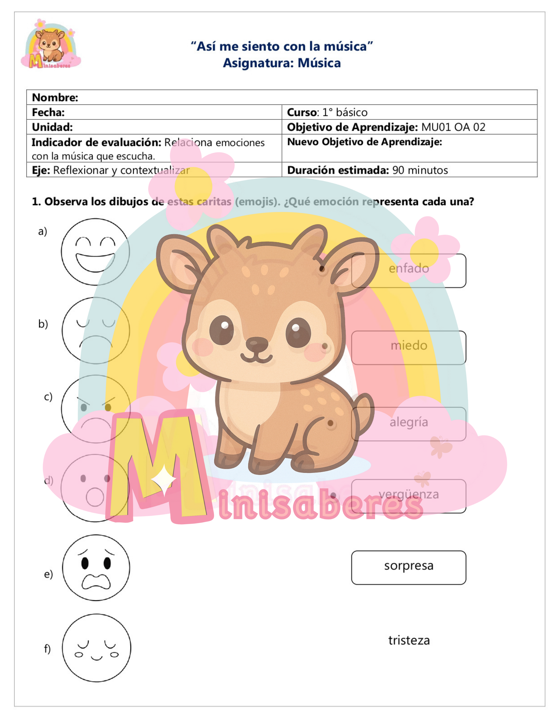 Esta guía de aprendizaje fue cuidadosamente diseñada para niñas y niños de 1° básico, con un enfoque lúdico, sensible y accesible que invita a explorar las emociones que la música puede provocar. A través de melodías especialmente seleccionadas, las y los estudiantes escuchan atentamente, identifican lo que sienten y representan gráficamente sus emociones, desarrollando habilidades de percepción auditiva, autoexpresión y conexión afectiva con el arte.