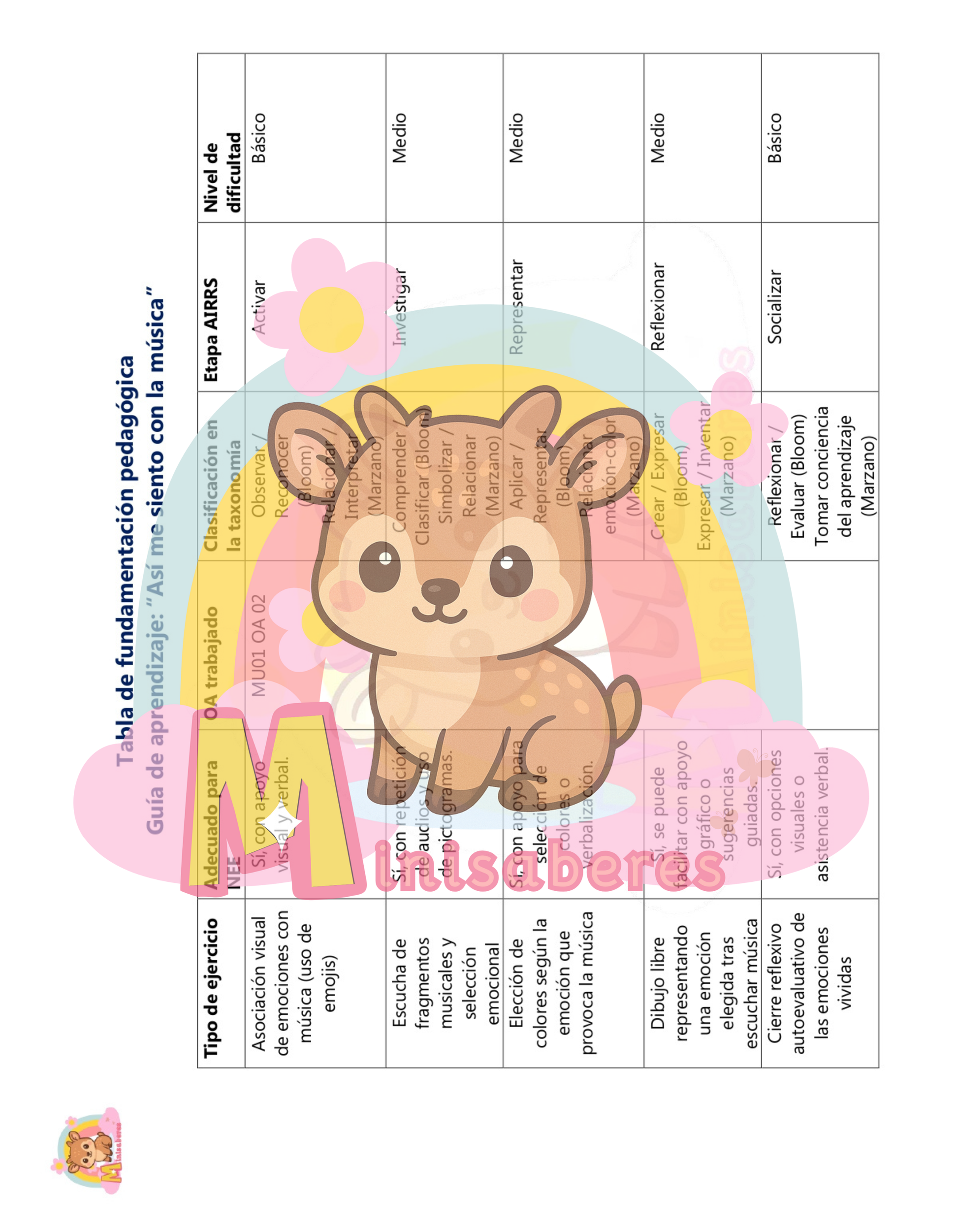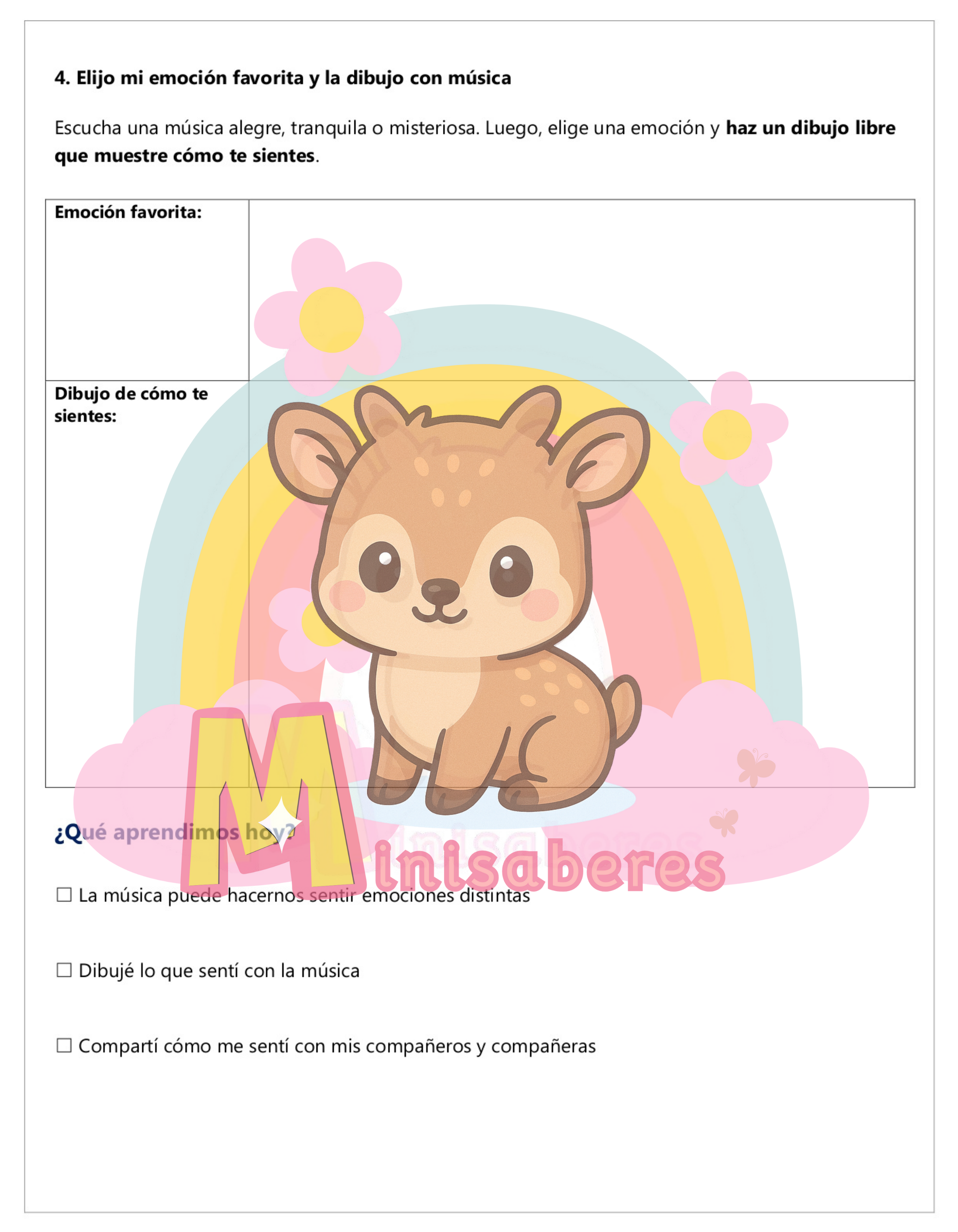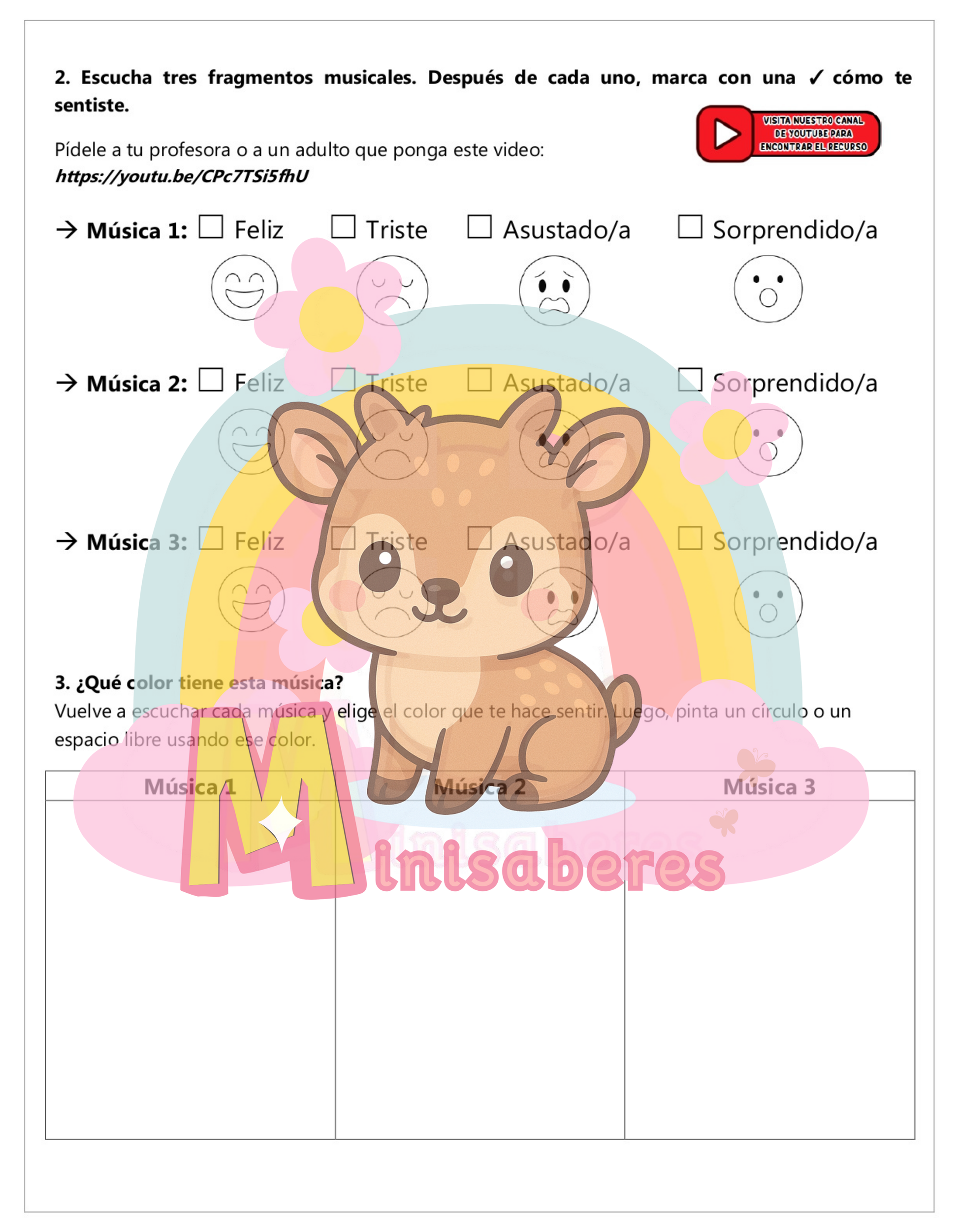 🎧 Uno de los elementos centrales de esta guía es un video exclusivo en YouTube que presenta 3 fragmentos musicales contrastantes. Cada uno de ellos ha sido escogido para evocar distintas emociones, permitiendo que los niños y niñas identifiquen cómo se sienten al escucharlos y lo expresen a través del dibujo y el color. Esta experiencia transforma la guía en un recurso multisensorial, emocionalmente significativo y altamente motivador.
