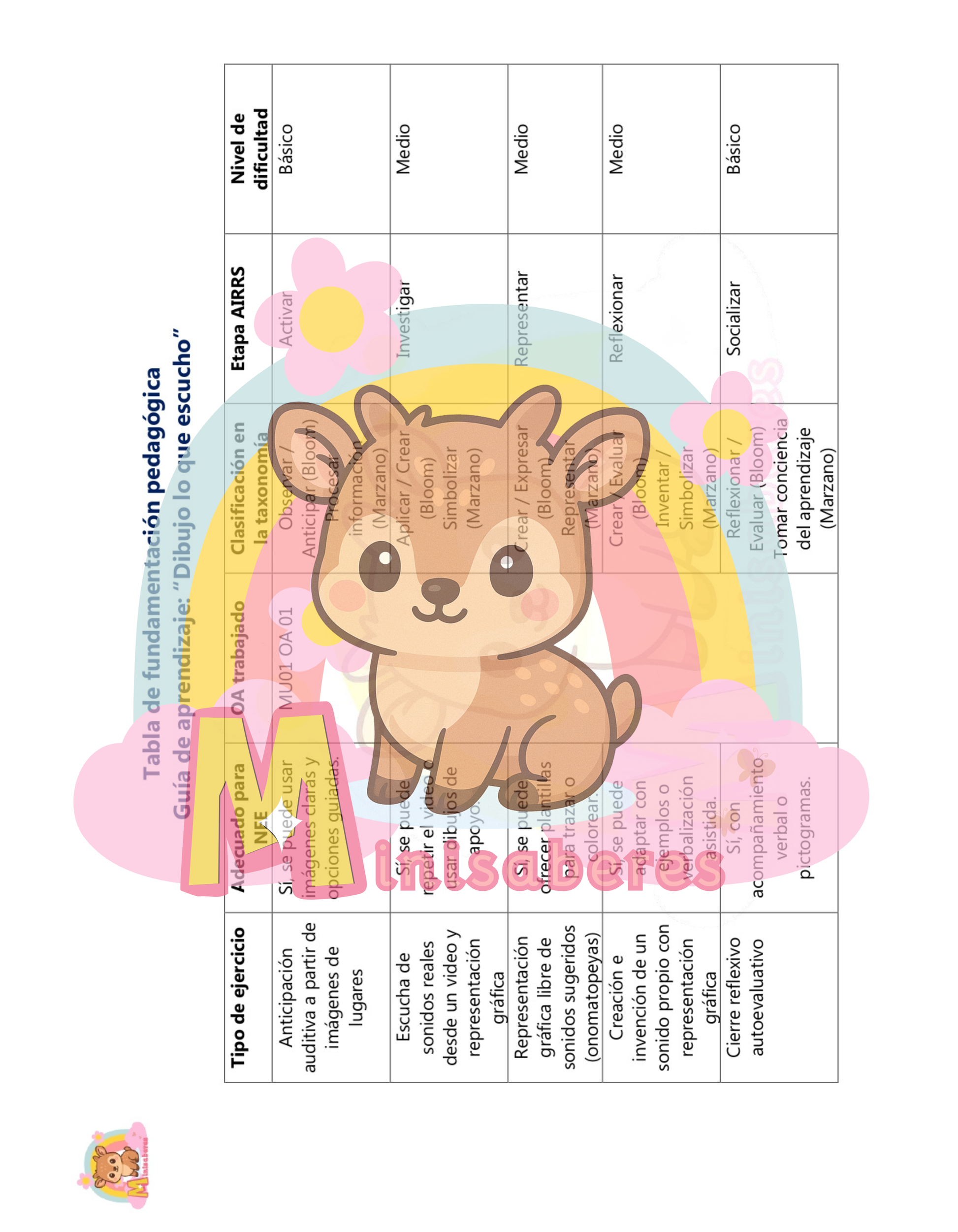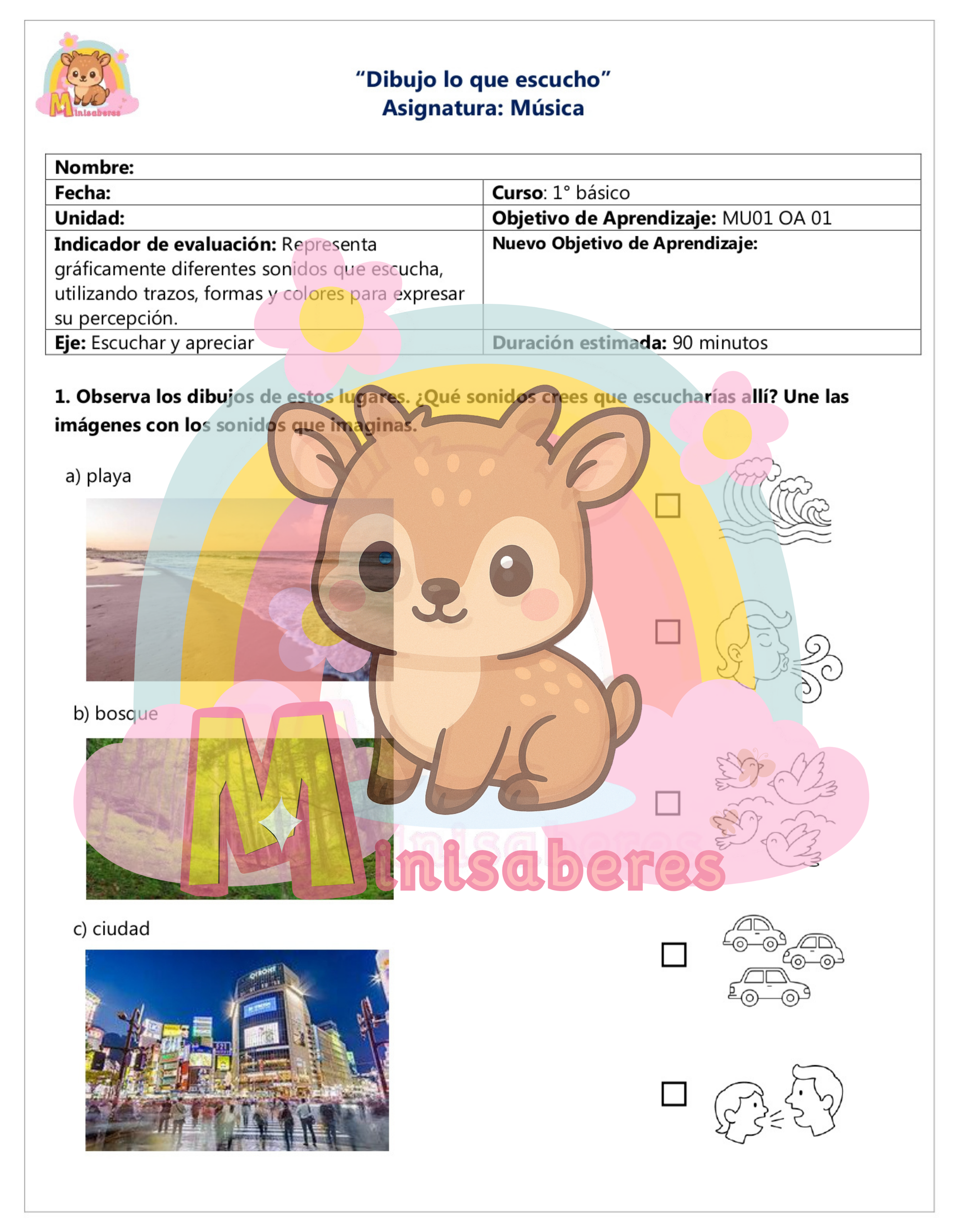 Esta guía de aprendizaje fue cuidadosamente diseñada para niñas y niños de 1° básico, con un enfoque lúdico, visual y accesible que invita a representar gráficamente sonidos reales e imaginarios, desarrollando la percepción auditiva, la creatividad y la expresión personal. A través del dibujo, los colores, las líneas y las formas, los estudiantes transforman lo que escuchan en una obra visual significativa.