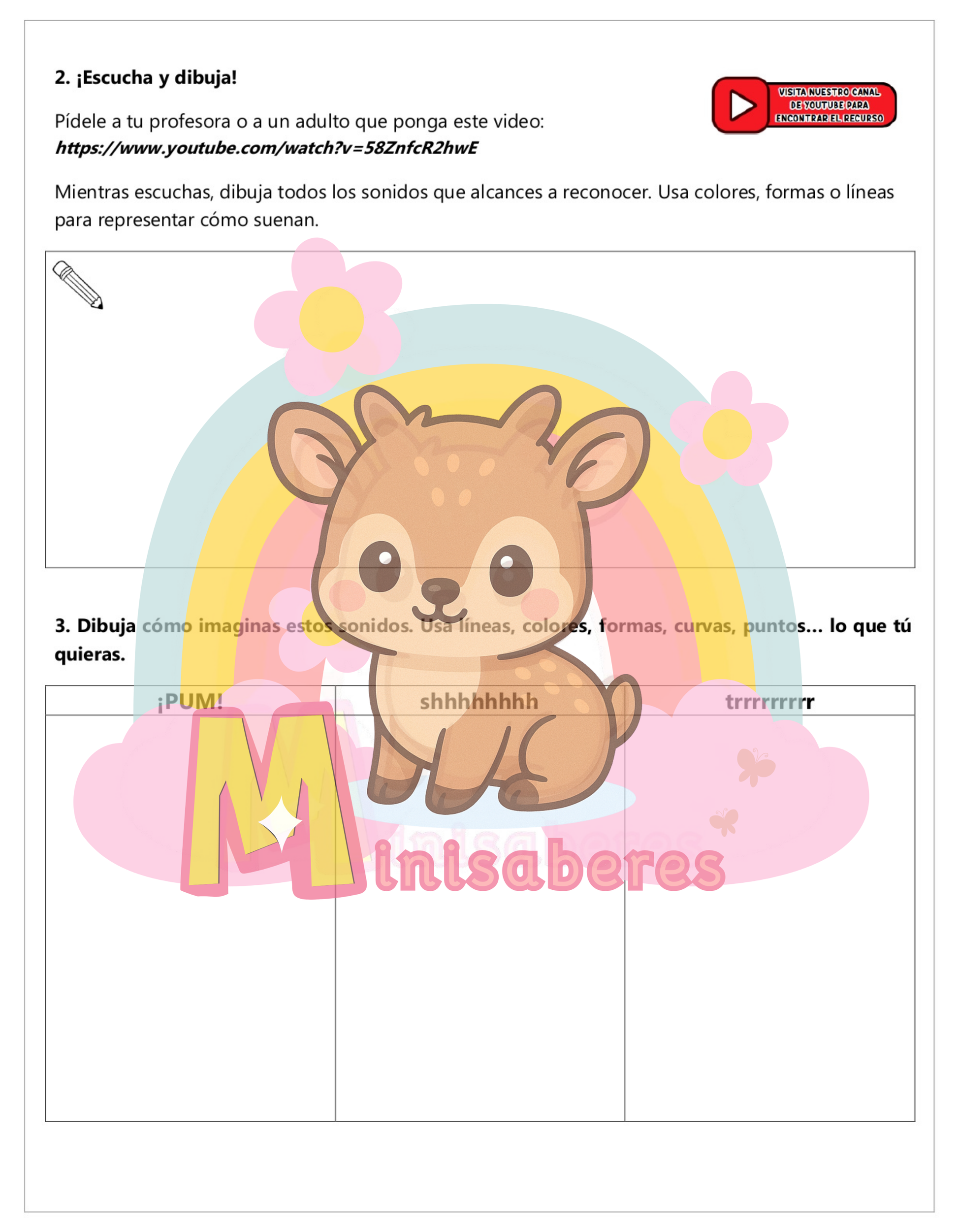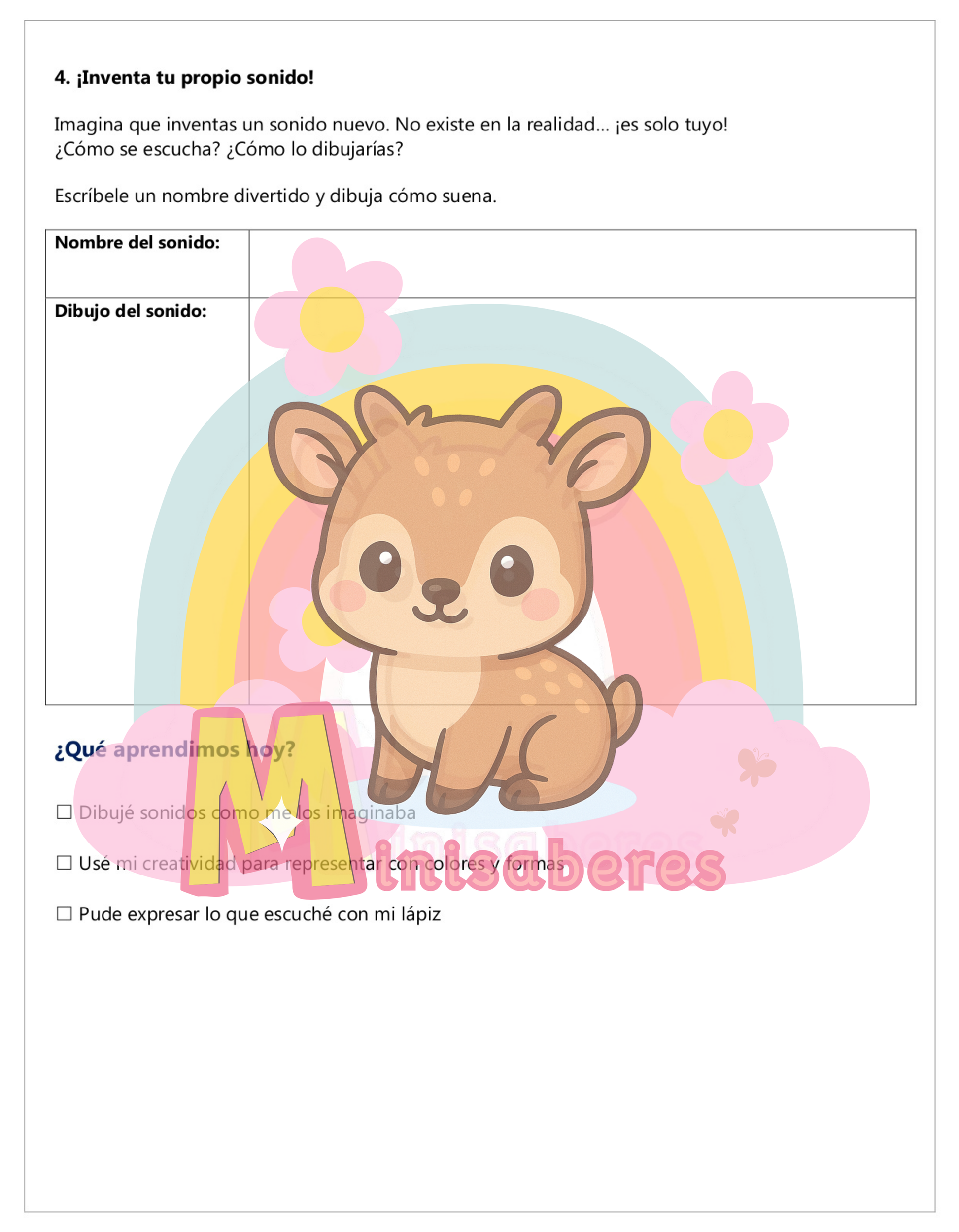 🎧 Lo más destacado de esta guía es la incorporación de un video de YouTube que presenta 6 sonidos reales de la vida cotidiana. A partir de esta experiencia auditiva guiada, los y las estudiantes dibujan lo que escuchan, trabajando directamente desde un estímulo sonoro auténtico. Esta propuesta transforma la guía en una experiencia multisensorial y significativa, facilitando la conexión entre el mundo real y la representación simbólica.