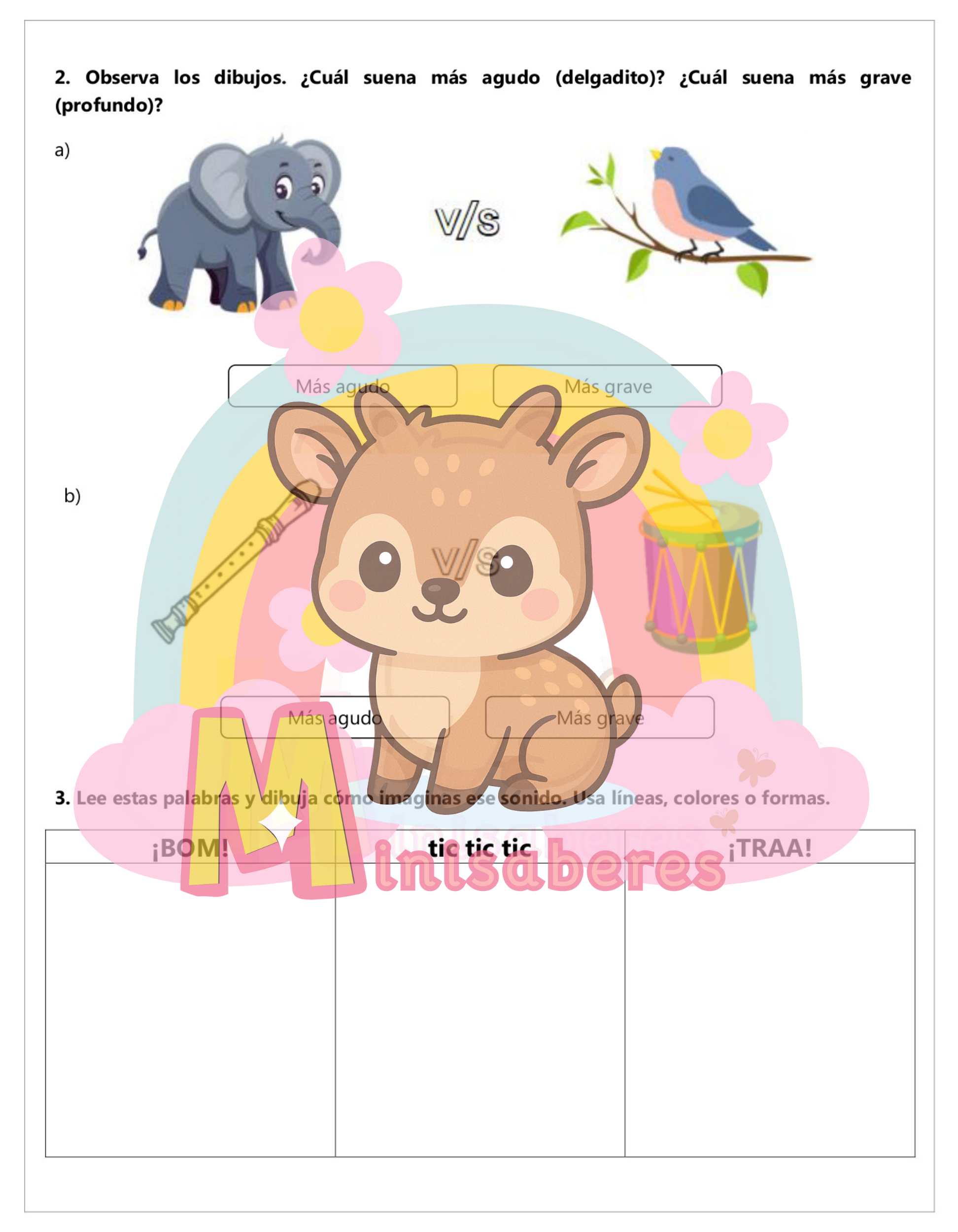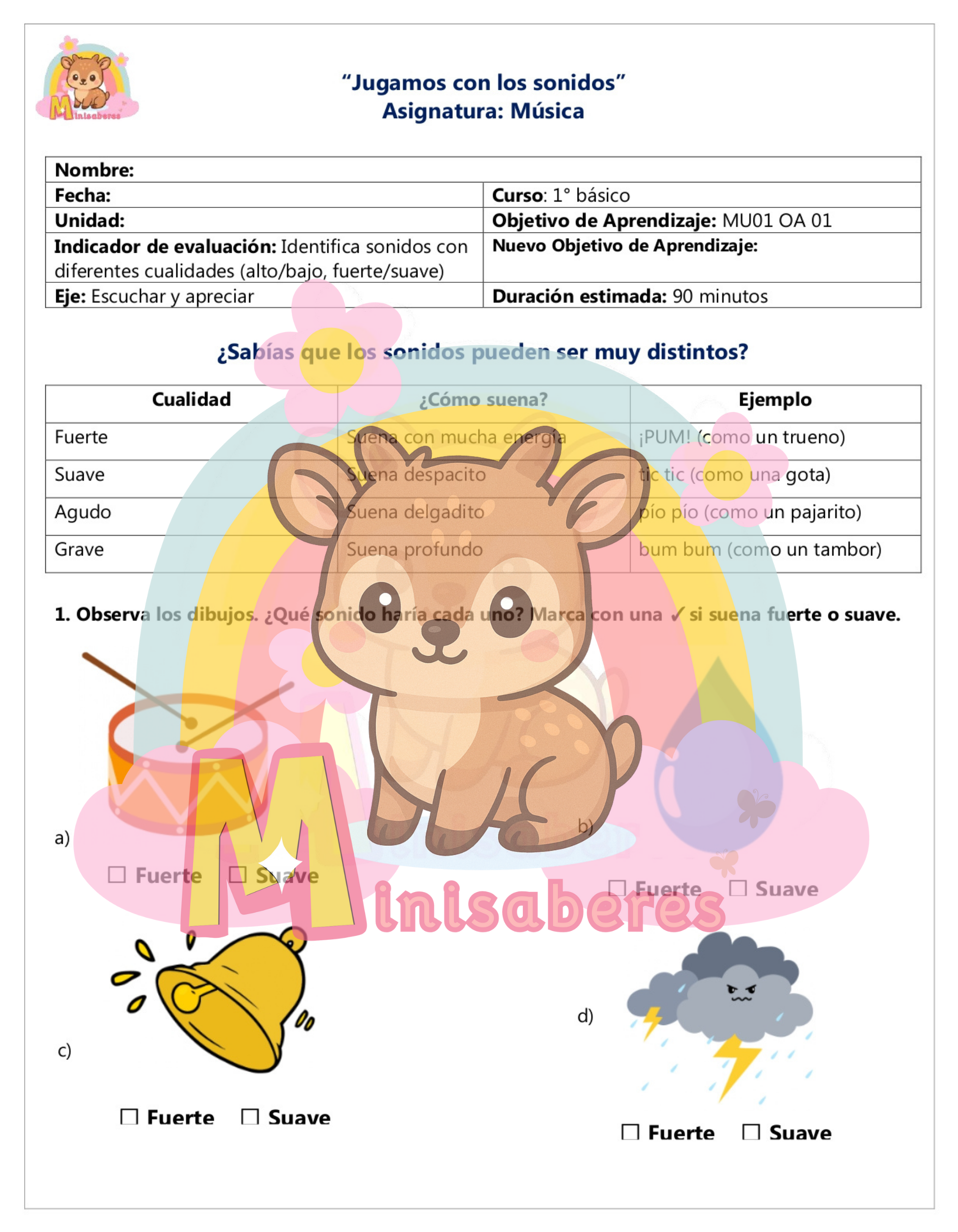 Esta guía de aprendizaje fue cuidadosamente diseñada para niñas y niños de 1° básico, con un enfoque lúdico, visual y accesible que permite introducir los primeros conceptos musicales de manera significativa. Está pensada para trabajar la percepción auditiva, la clasificación sonora y la expresión artística a través del dibujo, la escucha activa y el juego.