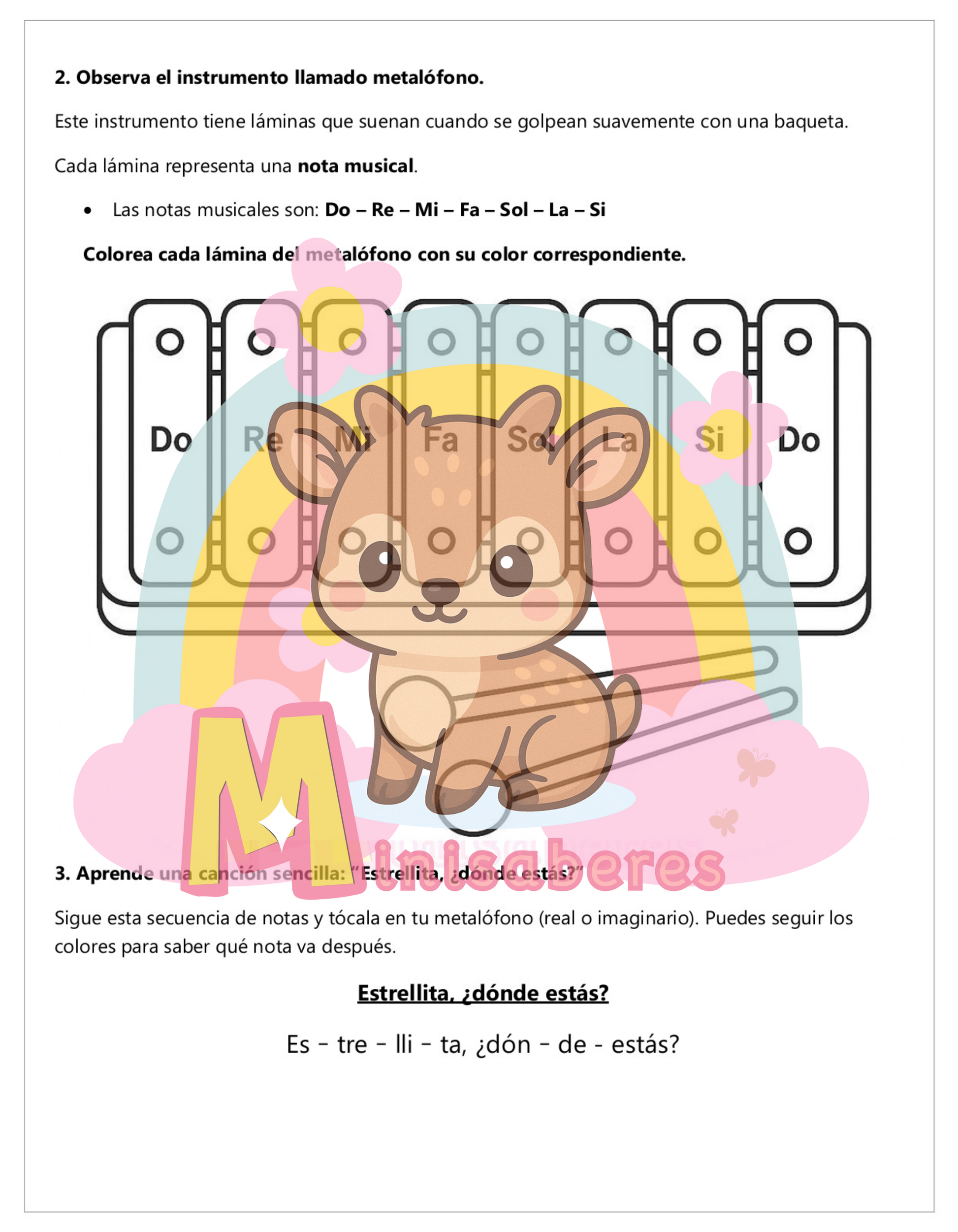 A partir de la canción infantil “Estrellita, ¿dónde estás?”, se propone una experiencia musical que culmina en la interpretación con metalófono. La secuencia comienza con la nota DO, que en esta guía está representada con el color azul. Además, los niños y niñas crean su propia secuencia de notas usando círculos de colores, desarrollando la percepción auditiva, la creatividad, la motricidad fina y el sentido musical.